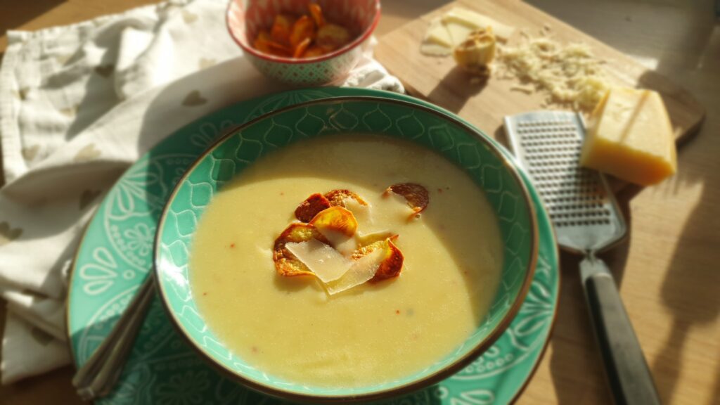 Chilis burgonyakrémleves sült fokhagymával és parmezánnal