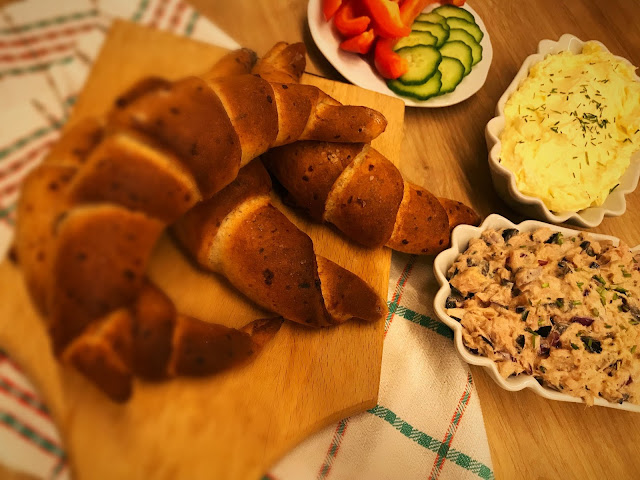Már többször bebizonyosodott, hogy egy jó házi készítésű pékáru valamilyen „kencével” szuper és gyors vacsora, amit aztán általában egyik vendégünk se tud abbahagyni. A múlt héten unokatesóm volt nálunk, és az öcsém is befutott, aki talán a finom illatok miatt, de végül szintén maradt velünk vacsorára. A parmezános-kakukkfüves kiflijeimet már mutattam nektek, ami mellé a Havas Dóra féle tonhalkrémet készítettem (amit már többen is agyon dicsértek, olyanok is, akik nem szeretik a tonhalkrémet), és az Édesanyánk által gyerekkorunkban oly sokszor készített fokhagymás juhtúrót. Aki ezt eszi, nem is hiányolja feltétlen a húst vacsorára, így a hamarosan következő böjti időszakban is szuper receptek ezek.