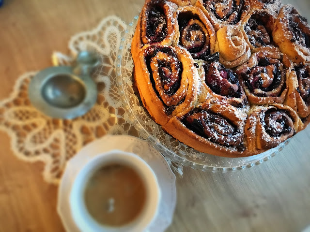Sütőpapírral kibélelek egy tepsit, ráhelyezek egy tortakarikát, amit kivajazok, majd a belsejében szépen elrendezem egymás mellett a csigákat és mindenhol megkenem vajjal a tetejét, majd lefedve további 30 percig kelesztem. Közben előmelegítem a sütőt és ha szépen megkelt a csigatorta 35-40 perc alatt szép aranybarnára sütöm, majd amikor langyosra hűlt, lassan kiveszem a formából, porcukorral meghintve tálalom.