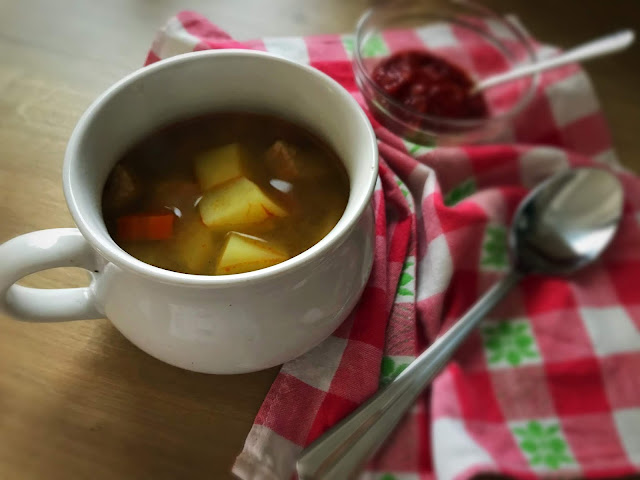 Az előző levesnél, a krumplilevesnél említettem, hogy megmaradt a leve, így azt felhasználtam ehhez a leveshez alaplének. Amikor elindult a karanténes élet itthon vettünk 1,5 kiló sertéslapockát, amiből készítettem pörköltet teljesen hagyományos módon (lásd a recept alatt). Ezt az adagot 3 részben fagyasztottam le, terveim szerint egyik adag elég lesz ötünknek nokedlivel és uborkasalátával, a másik feléből esetleg székelykáposzta készül majd, a harmadikból pedig lett ez a gulyásleves.