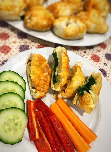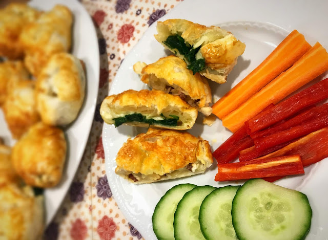 Azért mikor múlt héten Férjem úgy hívott hazafele jövet, hogy mi lesz ma a vacsora, sejtettem, hogy ez a fenti „menü” most nem lesz elég, így megnéztem mi van a hűtőben. Volt itthon két tekercs levelestészta, ez adta az ötletet ezekhez a batyukhoz, amiket már sokszor, sokféle variációban elkészítettem, így valóban csak az alapanyagok szabnak határt, bármit beletehettek, a lényeg, hogy valamilyen sajt mindenképpen kerüljön bele, mert az nagyon jól megolvad benne, és összetartja a többi hozzávalót is benne. Ez az adag nekünk (2 felnőtt+2 gyerek, mert a legkisebb mást kapott) elég volt két vacsorára is egyik nap salátával, másik nap friss zöldségekkel.