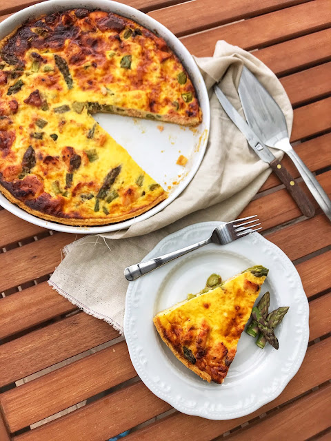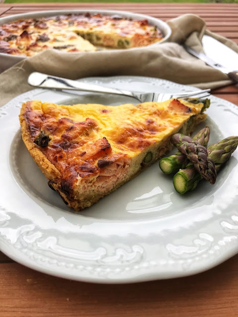 Most kicsit gomboz a kabát elven készült az ebéd, mert korábban lefagyasztottam egy kis darab lazacot, hogy jó lesz ez még valamire, és volt itthon egy csomag zöld spárgánk, így ez adta az alapot ehhez a finom pitéhez, amiből egyszerre csak egy szeletet tudtunk megenni, így több napra is elég volt. Fogyasztható melegen, langyosan, de akár hidegen is, ebédre vagy vacsorára, szóval elég sokrétű.