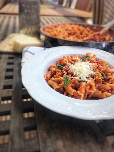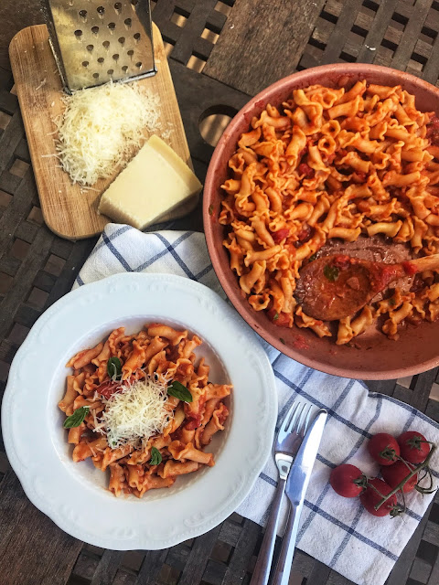 Az egyik legnagyobb ajándék amit a blogomtól kaptam egy fantasztikus barátnő, akit a családom úgy tud azonosítani, hogy tudjátok, a gasztrobarátnőm. Valahányszor találkozunk, mindig meglep valami különlegességgel, legutóbb ezt a gigli névre hallgató tésztát hozta nekem, amivel korábban még sosem találkoztam, de ahogy ő is mondta, mindenképpen valamilyen „szószos” tésztaételnek volt ez tökéletes alapja. Mivel hétvégén nem volt kedvem a melegben sokat bajlódni az ebéddel, ezt a villámgyors paradicsomszószt készítettem hozzá, amihez a kertből szedtem a fűszereket, akkor lesz még tökéletesebb az érzés, ha a paradicsom is a kertből lesz, de annak még egy picit érnie kell, addig ez a verzió is kiváló.