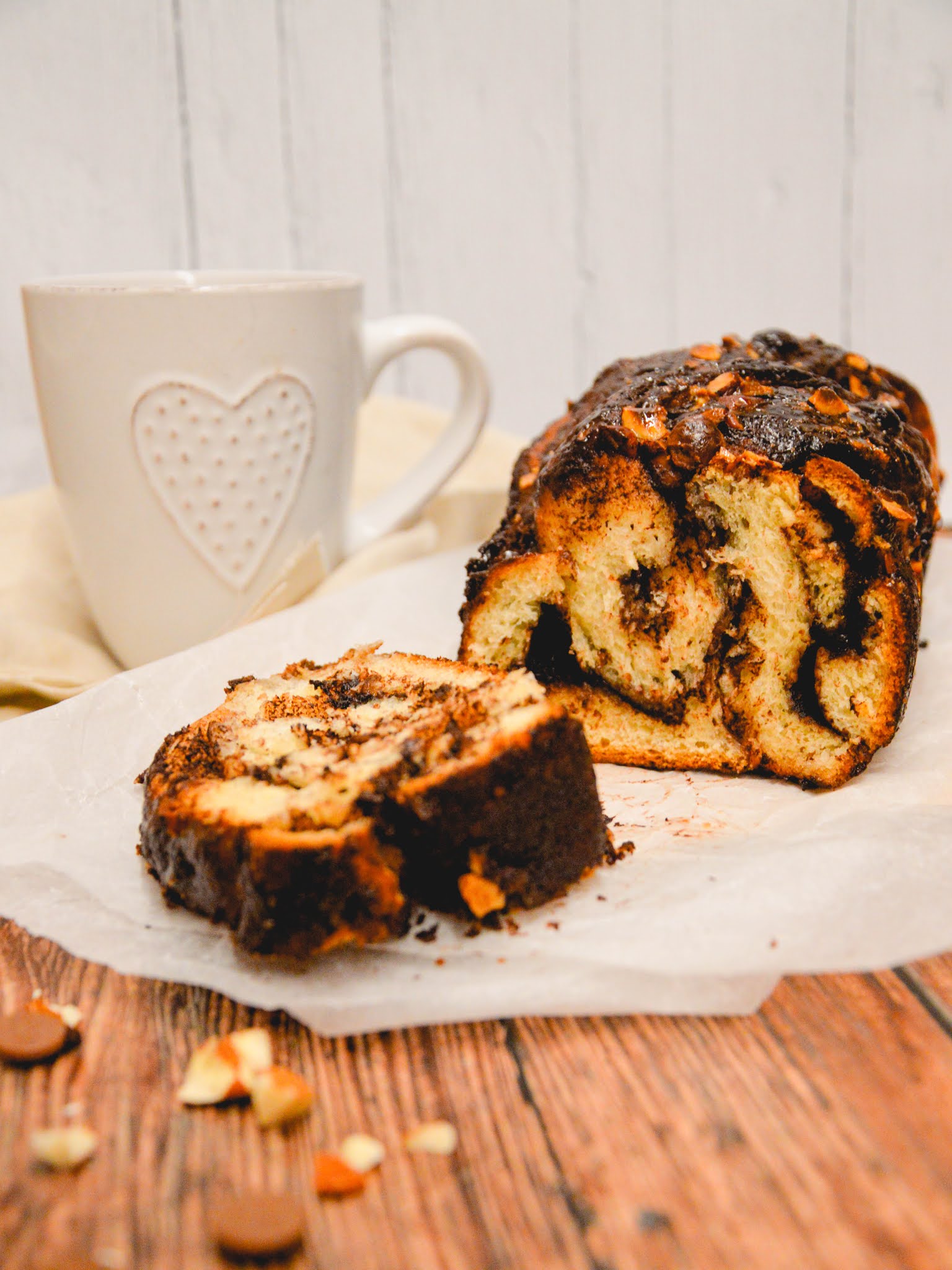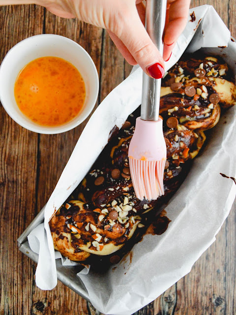 A tésztát kétfelé osztom, amit gömbölyítek, majd letakarva újabb 15 percig pihentetem. Ujjnyi vastagra nyújtom őket, megkenem a töltelék felével, majd a hosszú oldalánál fogva feltekerem. Hosszában kettévágom, befordítom őket úgy, hogy a töltelékes fele felfelé nézzen, majd a közepétől kezdve elkezdem összetekerni először az egyik, majd a másik vége felé arra figyelve, hogy a vágott felület mindig felfelé nézzen. Ugyanígy elkészítem a másik kalácsot is.
