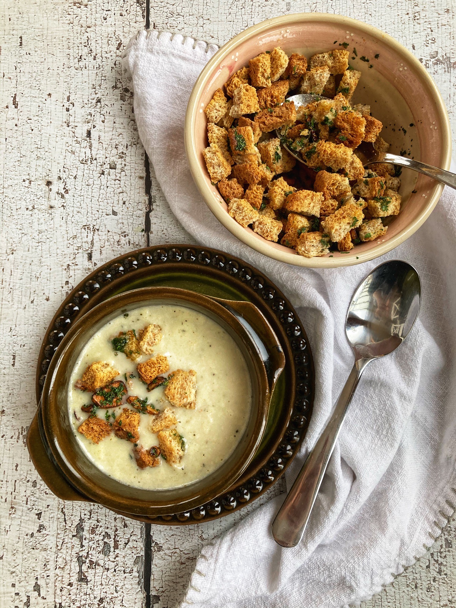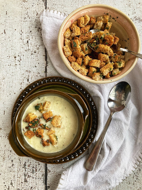 A megpirult kenyereket felkockázzuk összekeverjük olívaolajjal, sóval és aprított petrezselyemmel, majd ezt kanalazzuk a krémes leves tetejére.