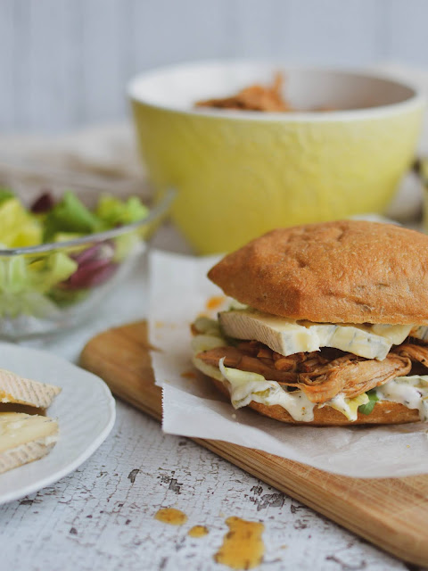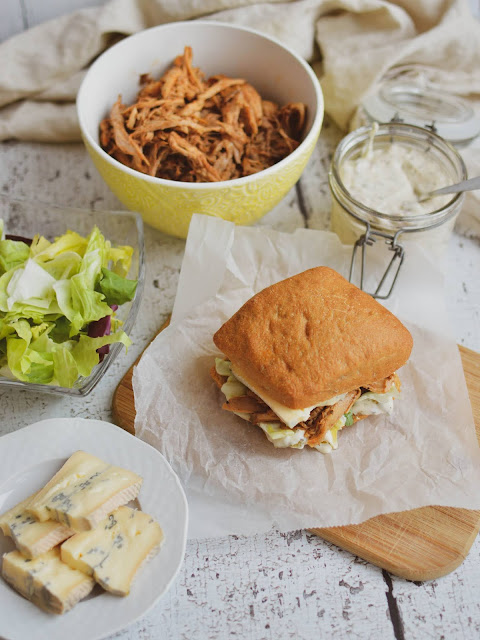 Összeállítom a szendvicseket: megpirítom a félbe vágott ciabattákat, mindkét felüket megkenem a mártással, az alsó felükre ráhalmozom a salátát, ízlés szerinti hús mennyiséget valamint kéksajtot, ráhelyezem a tetejüket és már fogyaszthatjuk is.