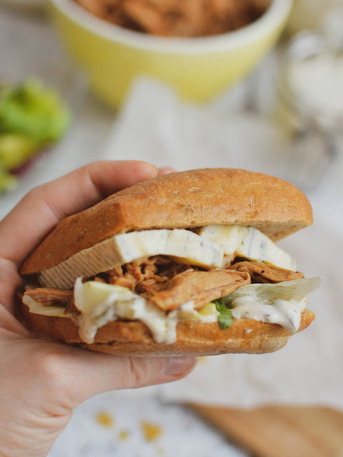 A fűszereket, a paradicsompürét, a szójaszószt, a balzsamecetet, az olajat és a vizet összekeverem, majd alaposan bedörzsölöm vele a megtisztított sertéscombot. Lassúfőzőbe teszem és 12 órán keresztül ebben főzöm-sütöm. Amikor elkészül a hús, kiemelem a szaftjából és két villával teljesen szétbontom, majd annyi szószt adok hozzá, amitől kellően szaftos marad a hús.