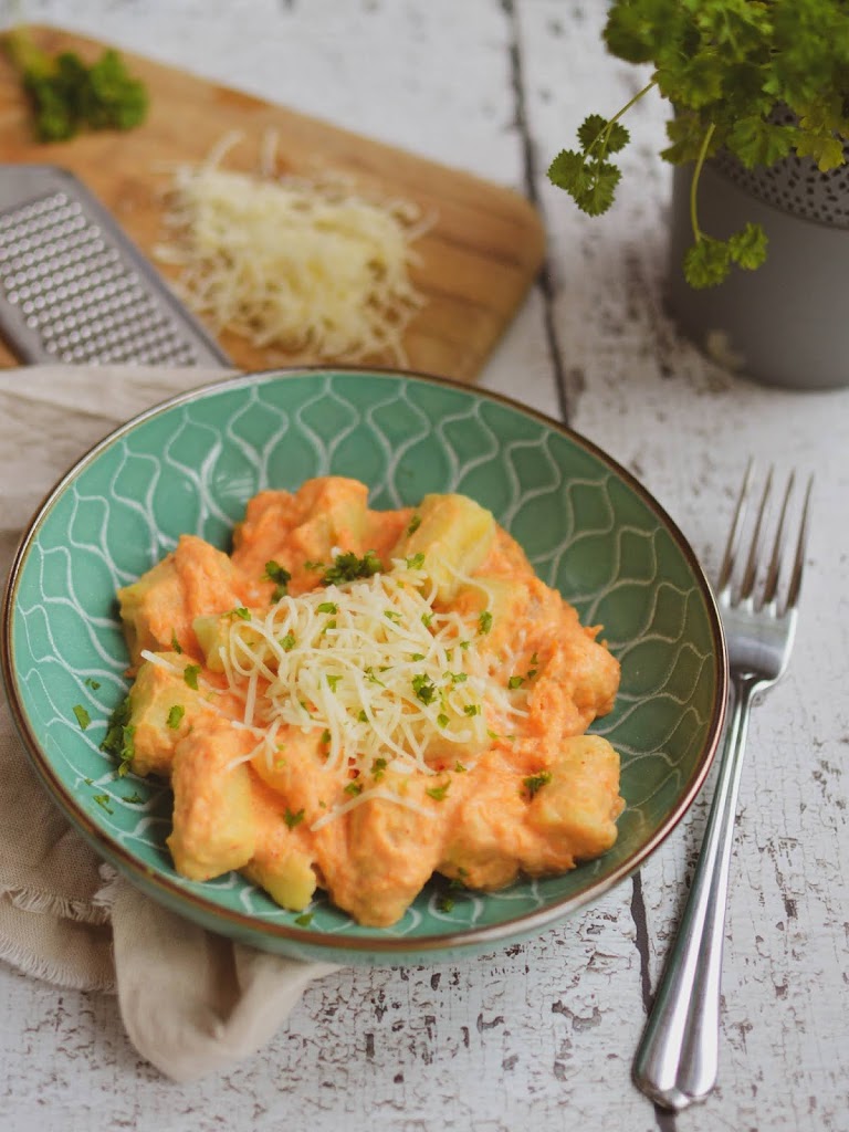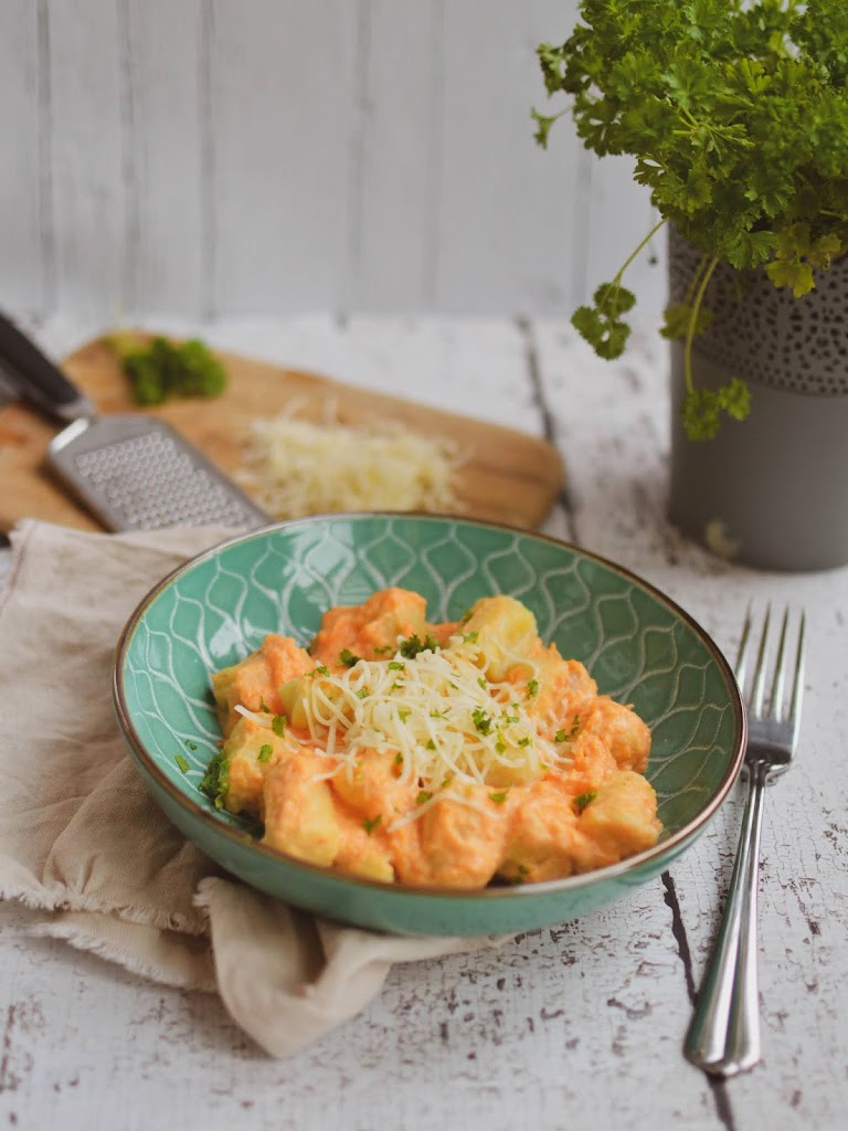Lobogó, enyhén sós, forró vízben kifőzöm őket. Megvárom, amíg feljönnek a víz tetejére, és innentől számított 1 percig főzöm őket. Közben elkészítem a mártást, amihez a sütőtököt botmixerrel simává pürésítem, serpenyőbe öntöm, hozzáadom a tejszínt, fűszerezem sóval és cayenne borssal, majd egyet forralok rajta. A leszűrt gnocchikat átszedem a mártásba, összeforgatom vele, reszelt sajttal és petrezselyemmel tálalom.