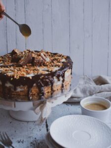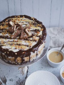 Másnap következik a torta díszítése. Az étcsokoládét felolvasztom mikróban a tejszínnel, de vigyázzunk, hogy ne hevítsük túl. Először ezzel csurgatom körbe a tortát, majd jöhetnek a Kinder Maxi Kingek, amiket előtte háromba vágtam. Megcsurgatom a sós karamellel, megszórom az aprított mogyoróval és már kész is.