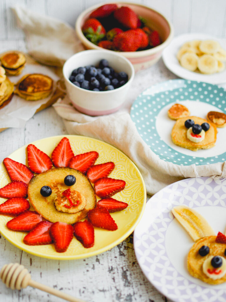 A száraz és a nedves hozzávalókat külön-külön összevegyítem, majd egy habverő segítségével egynemű tésztát keverek belőlük. Evőkanállal egy enyhén kiolajozott serpenyőbe adagolom a masszát, egyszerre legfeljebb 3-4 darabot. Mindkét oldalukat 1-1 percig sütöm, majd friss gyümölcsökkel tálalom állatarcokat formálva.