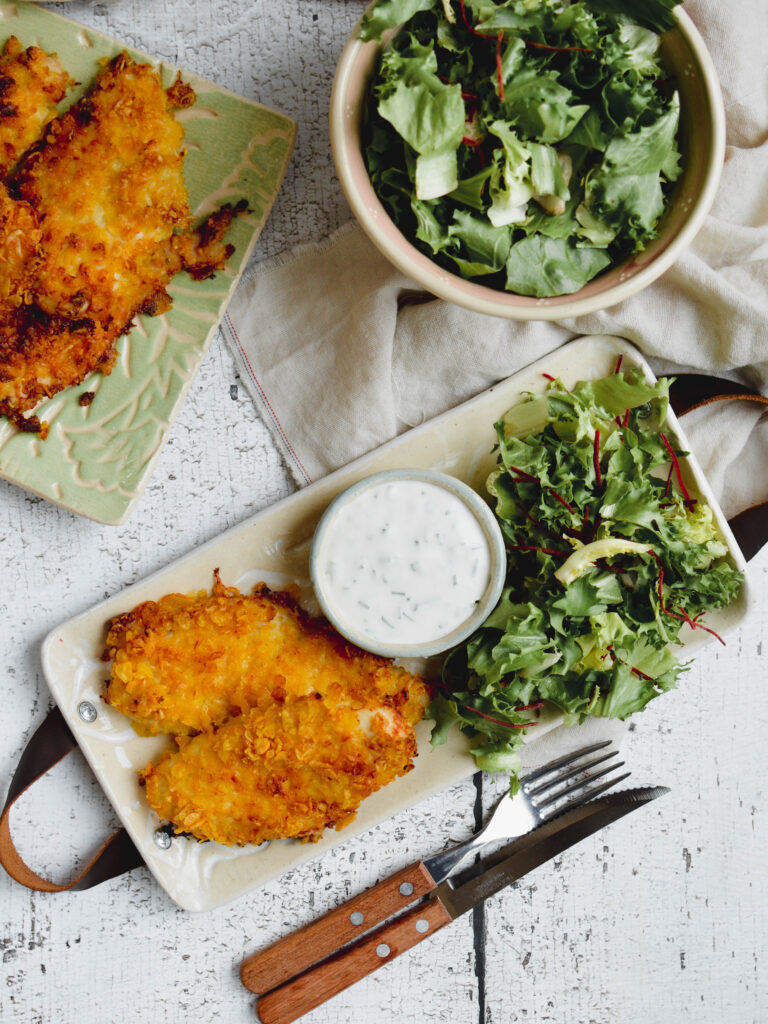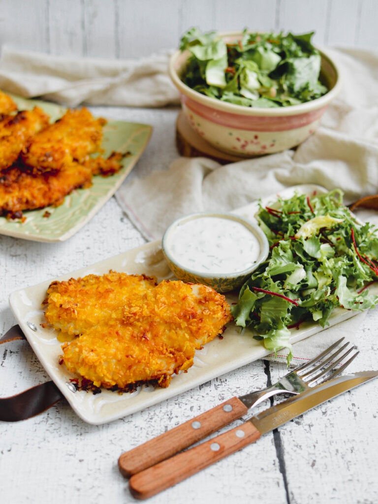 A tejet összekeverem az áttört fokhagymával, majd beleteszem a felszeletelt csirkemellet és 1 órára a pulton félre teszem. Egy késes aprítóban összeaprítom a corn flakest, hozzáadom a lereszelt parmezánt majd ebben megforgatom a csirkemelleket és sütőpapírral bélelt tepsire fektetem őket. Mindegyik tetejére teszek egy-egy kis darab vajat, majd előmelegített, légkeveréses sütőben 25 percig sütöm őket.