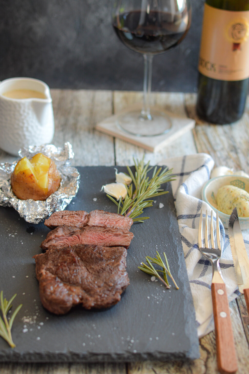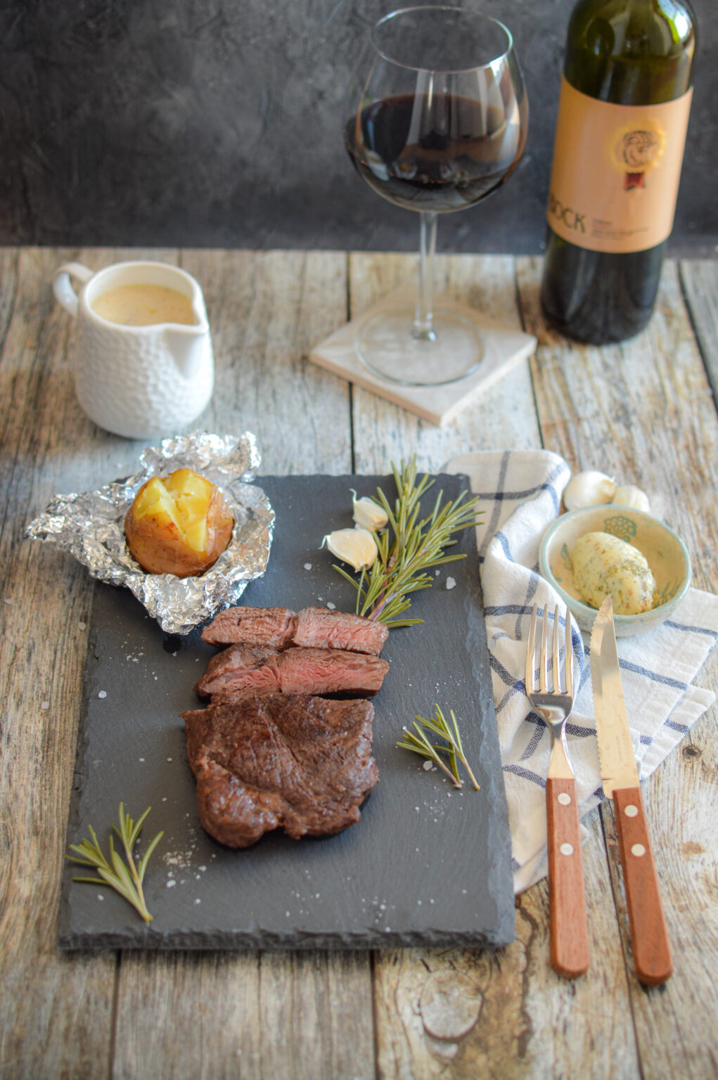 Egy forró serpenyőben vajat olvasztunk és a szuvidált marha szeletek mindkét oldalát másfél-másfél perc alatt megpirítjuk. Pár percig pihentetjük, majd a héjában sült burgonyával, a fűszervajjal és a borsmártással tálaljuk.