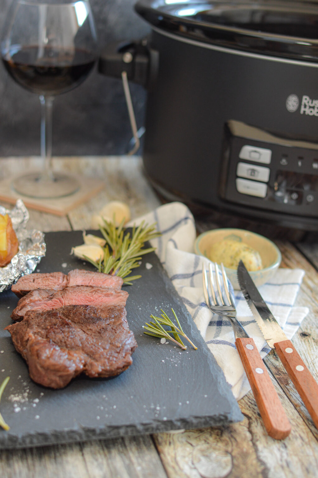A steak szeleteket alaposan megtöröljük, majd mindkét oldalukat sózzuk és borsozzuk. A hús tetejére helyezünk 1-1 kis ág rozmaringot és 2-2 kicsi vajkockát, majd vákuumozzuk őket külön-külön tasakban. A lassúfőzőbe 2 liter meleg csapvizet öntünk, belehelyezzük a fém elválasztó rácsot és közé tesszük a levákumozott húsokat, majd bekapcsoljuk a gépet szuvidáló funkcióra. Közepesen átsült steak-hez 60 fokra állítjuk a gépet és 1 órát szuvidáljuk benne a húsokat.