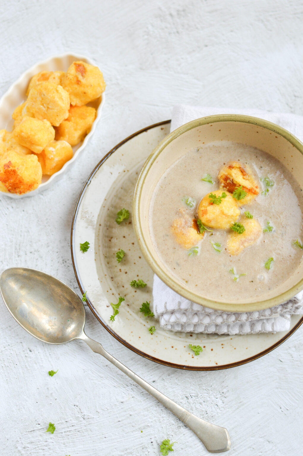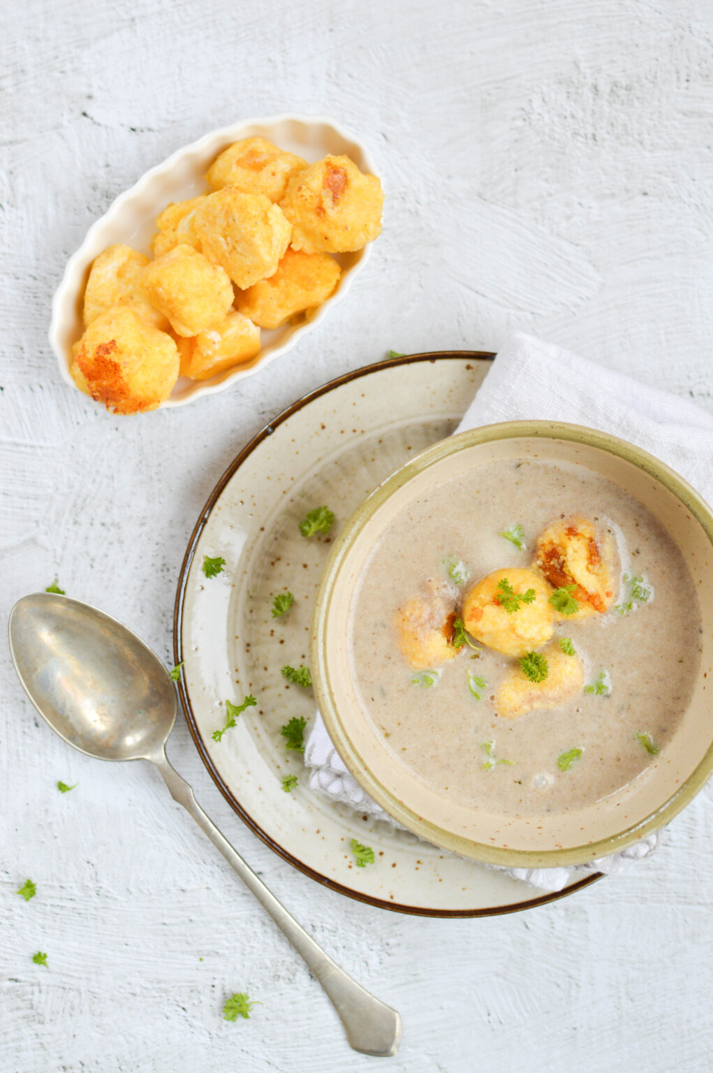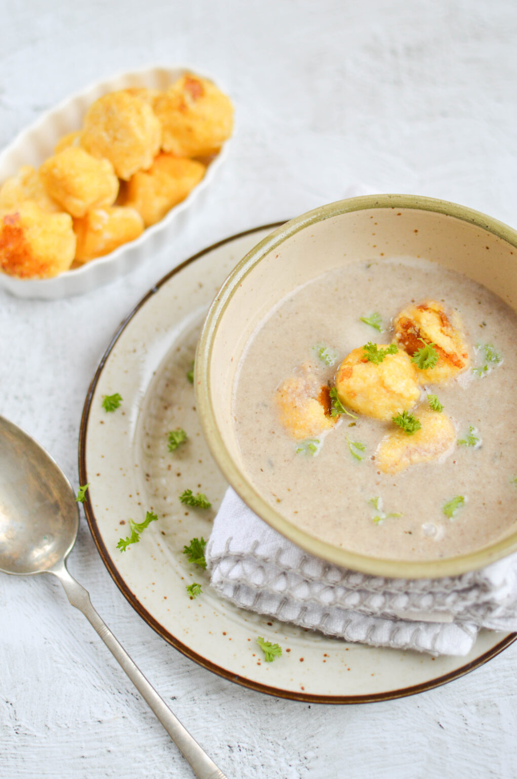A gombócokhoz felforraljuk a vizet, majd beleszórjuk a polentát, és 5 percig forraljuk. Levesszük a tűzről, hozzákeverjük a vajat, sózzuk, majd belekeverjük a lágy kecskesajtot is, és kihűtjük. Diónyi gombócokat formálunk, amelyeket kevés vajon körbepirítunk, és ezeket tálaljuk a gombakrémleveshez levesbetétként.