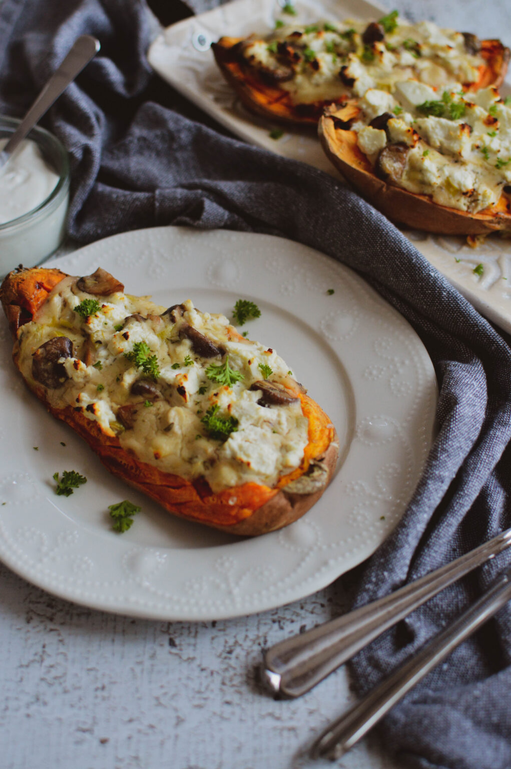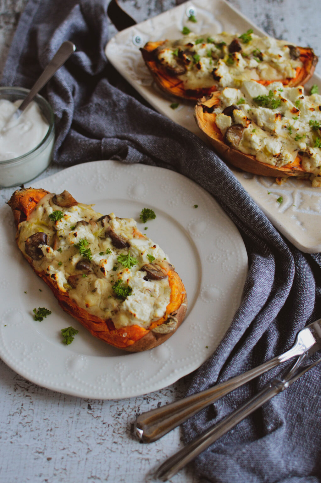 Kevés olajon zsírjára sütjük a negyedelt csiperkegombákat, majd félre tesszük. Ugyanabban az edényben megdinszteljük a karikázott újhagymát, majd visszatesszük hozzá a gombát, levesszük a tűzről és elkeverjük a sajtkrémmel is. Sóval, borssal fűszerezzük. Az elősütött édesburgonyák húsát villával kicsit benyomjuk, majd ide kanalazzuk a sajtkrémes-gombás tölteléket. A tetejüket megszórjuk morzsolt feta sajttal és 10-15 percig tovább sütjük őket. Tejföllel és igény szerint salátával tálaljuk.
