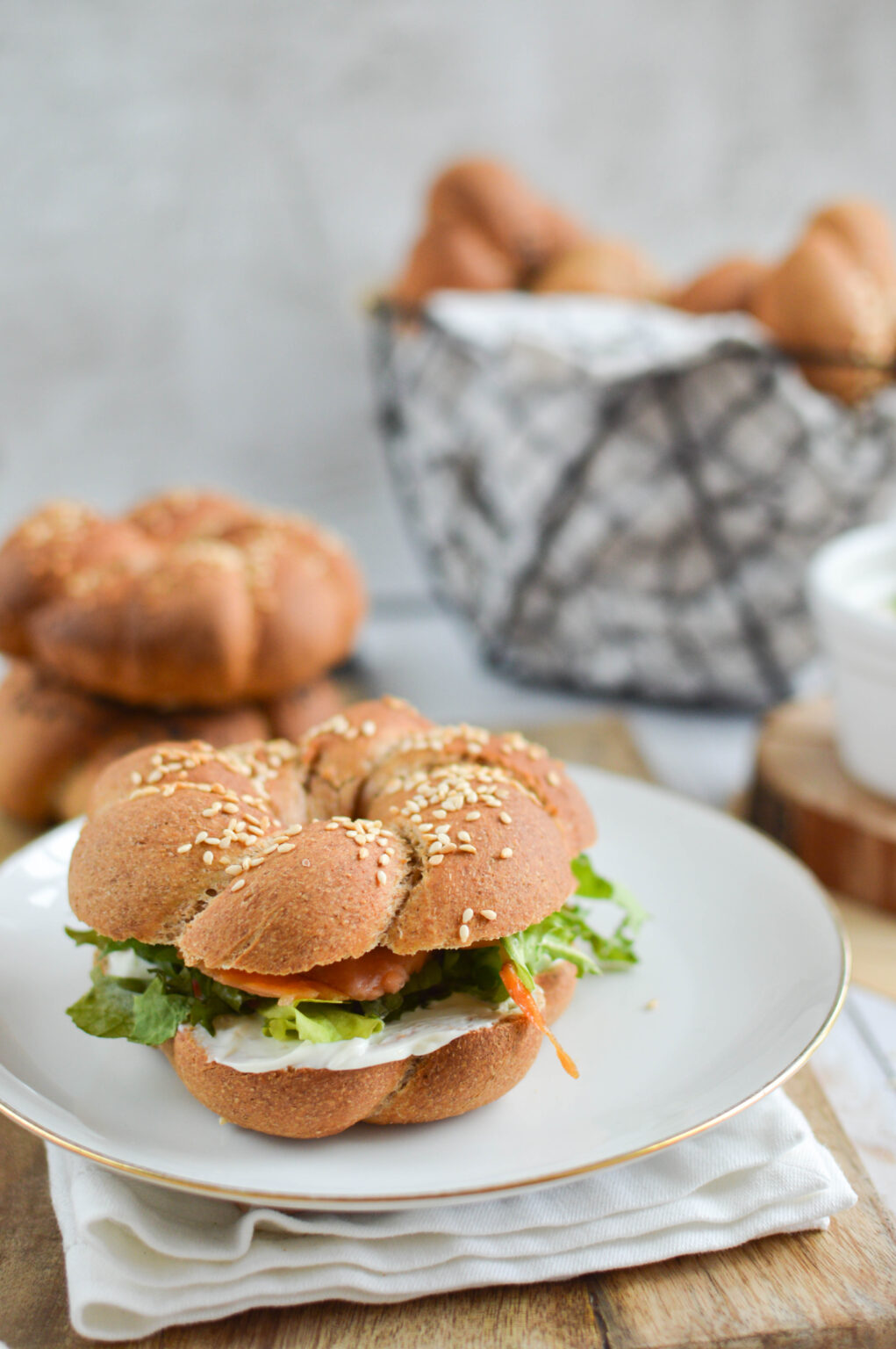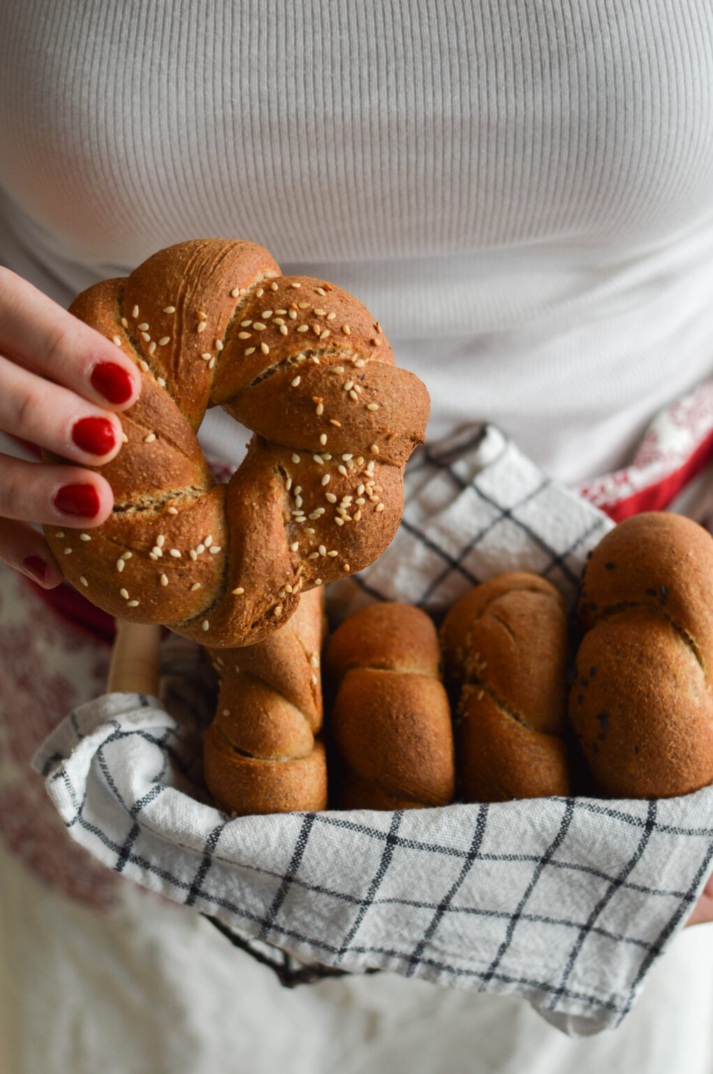 Az átszitált finomlisztet összekeverjük a rozsliszttel, a sóval, majd a közepébe mélyedést készítünk és ide öntjük a vizet, a tejet, a vajat, majd rámorzsoljuk az élesztőt és megszórjuk a cukorral. Alaposan kidagasztjuk, majd 40-45 percig kelesztjük. Lisztezett deszkára borítjuk, és 10 egyforma darabra vágjuk. Mindegyiket gömbölyítjük, majd konyharuhával letakarva 15 percig pihentetjük.