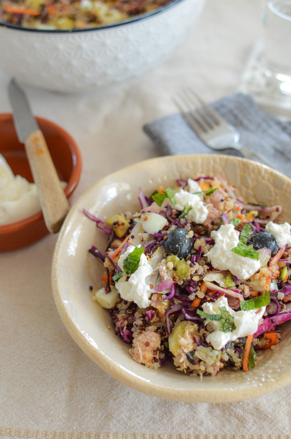 Így, hogy elindult az új tanév, hétköznap mindössze két főre készítek ebédet, de sokszor csak egymagamra, ami egyrészt nagyon furcsa érzés, másrészt így most más ételek készülnek részben ebédre, mert azért az én gyerekeim se ennének meg egy quinoa salátát, én viszont időnként kifejezetten szeretem ezeket a hideg, könnyed és persze gyors ebédeket. Amikor irodába jártam dolgozni, ezeket a salátákat üvegbe rétegezve vittem magammal, ilyenkor arra kell figyelni, hogy az öntet alulra kerüljön, mert akkor nem áztatja el a zöldségeket.