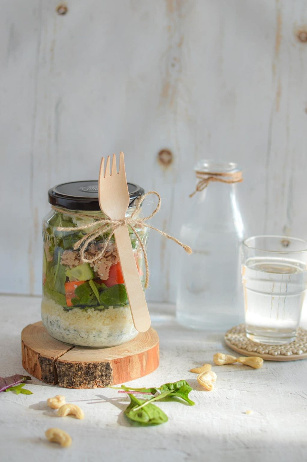 Amennyiben az üvegben réteges verziót szeretnénk elkészíteni, úgy ezt az adagot harmadolni kell, a sorrend pedig az alábbiak szerint alakul: alulra kerül az öntet, erre jön a quinoa, rá a zöldségek, majd a tonhal és a tojás, tetejére a burrata, a tökmag és a menta, majd fogyasztás előtt jól rázzuk össze.