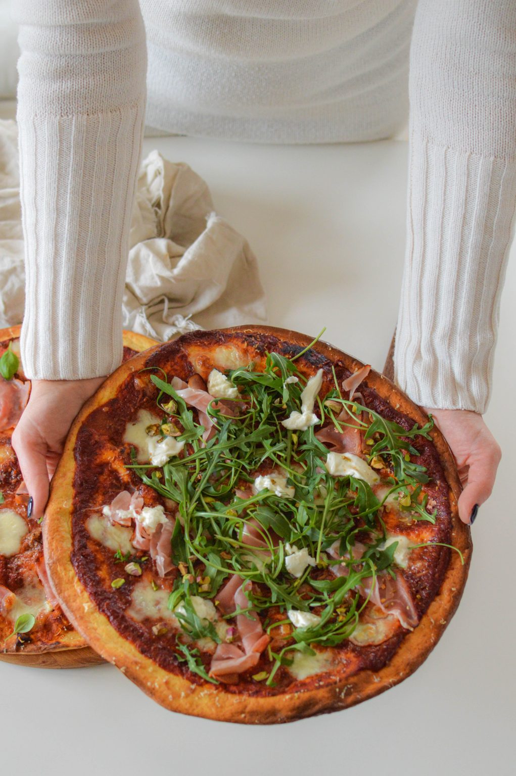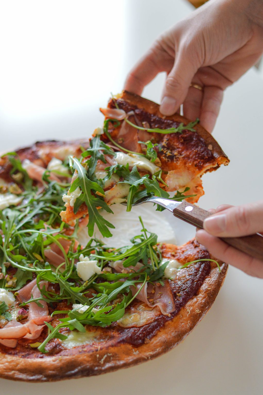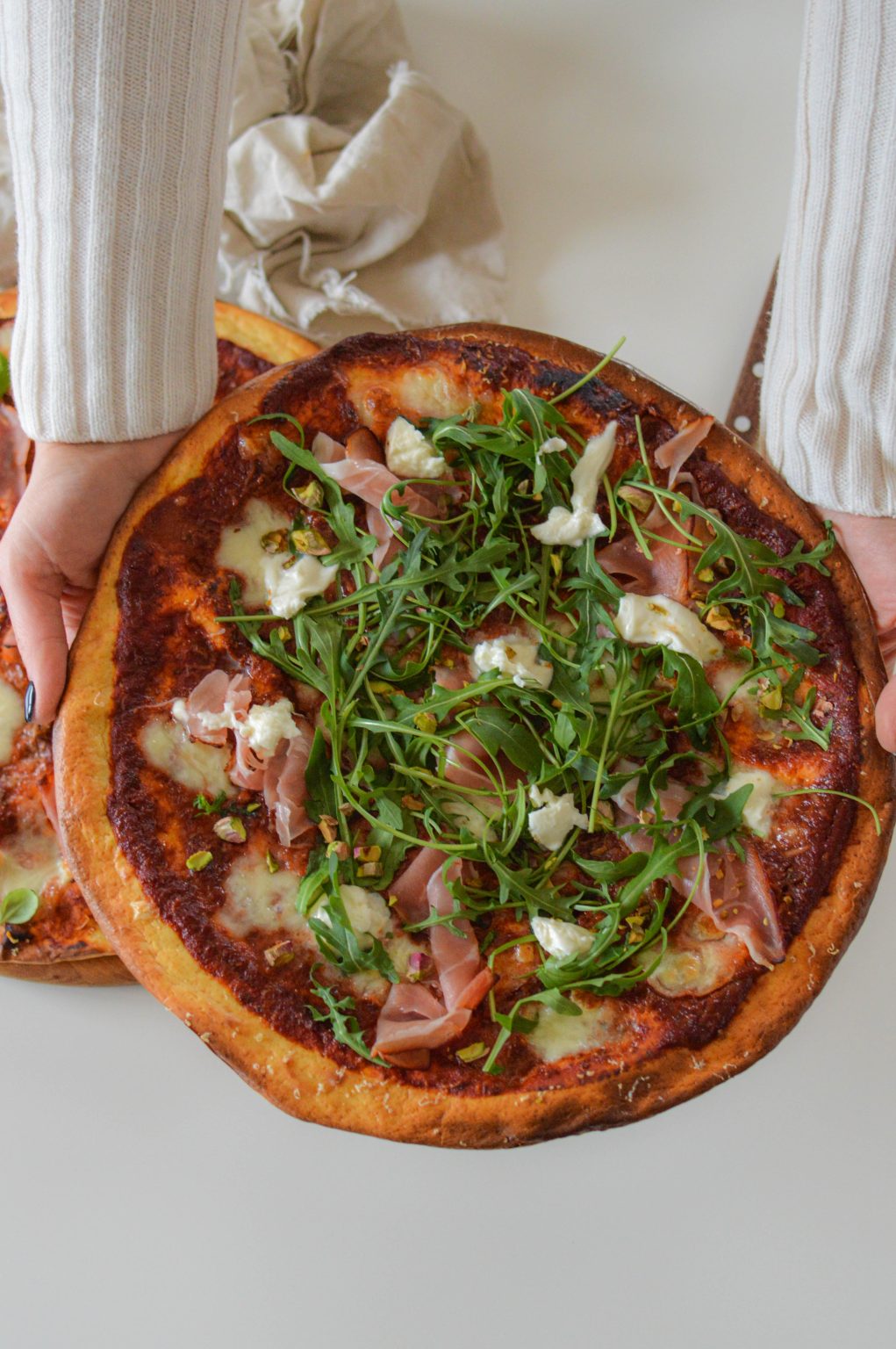 Kenjük meg a fűszeres paradicsompürével, szórjuk meg a parmezánnal, majd tépkedjünk rá sonkát és a mozzarella felét, illetve amennyiben a feketeerdő sonkás verziót választjátok, akkor csak mozzarellát tegyetek rá itt és toljátok vissza a sütőbe további 5-10 percre a pizzát, hogy megpiruljon a teteje. Miután elkészült rátépkedjük a feketeerdő sonkát és a maradék mozzarellát, ráhalmozzuk a rukkolát, majd megszórjuk az aprított pisztáciával.