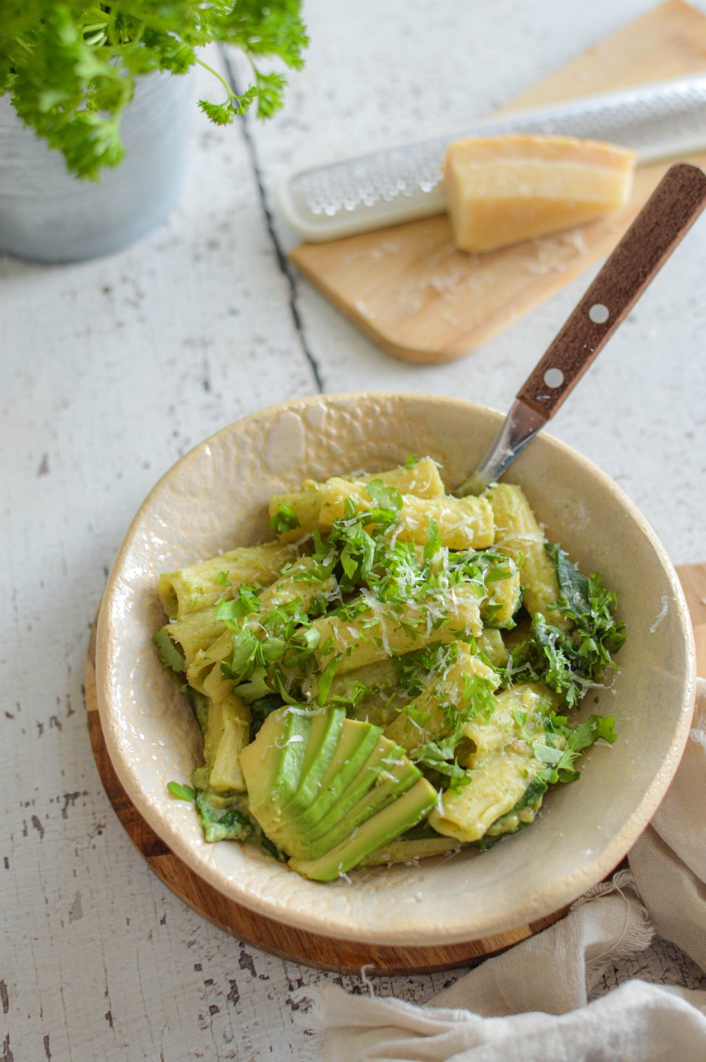 Egy késes aprítóban, vagy turmixban (vagy akár a botmixert is segítségül hívhatjuk) összemixeljük egymással a megpucolt avokádót, a petrezselymet, a fokhagymát, a napraforgómagot és a sörélesztőpelyhet. Egy serpenyőbe öntjük és annyi tészta főzővízzel öntjük fel, amennyire krémesre szeretnénk a szószt. Beleforgatjuk a tésztát, megszórjuk reszelt parmezánnal és friss salátával tálaljuk.