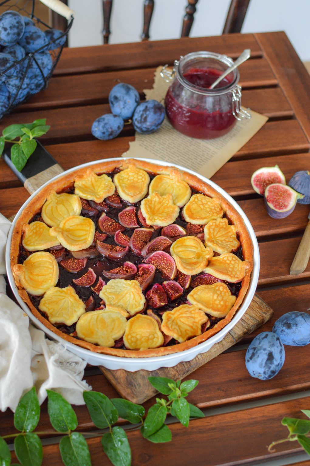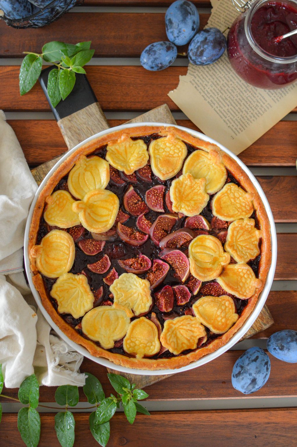 Lisztezett felületen vékonyra nyújtjuk, majd egy piteformába simítjuk, sütőpapírt helyezünk rá, és lencsével vagy babbal lesúlyozzuk. Előmelegített, légkeveréses sütőben 180 fokon 10 percig vakon sütjük, majd a sütőpapírt levesszük róla és további 5 percig sütjük. Kivesszük a sütőből és azért, hogy ne áztassa el a lekvár és a gyümölcs a tésztát először megszórjuk a darált dióval vagy mandulával a süteményt, és csak ezután kenjük meg a szilvalekvárral, majd körben elhelyezzük rajta a felszeletelt fügéket és a szélére sorakoztatjuk a maradék tésztából kivágott kis tészta darabokat. 20 perc alatt készre sütjük. Langyosan könnyen kiemelhető a formából.